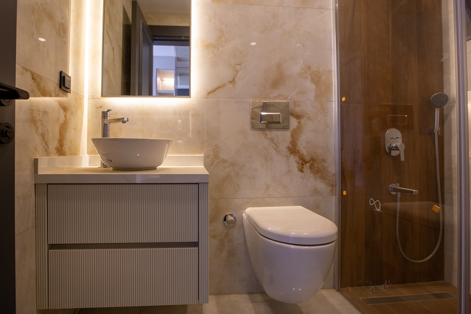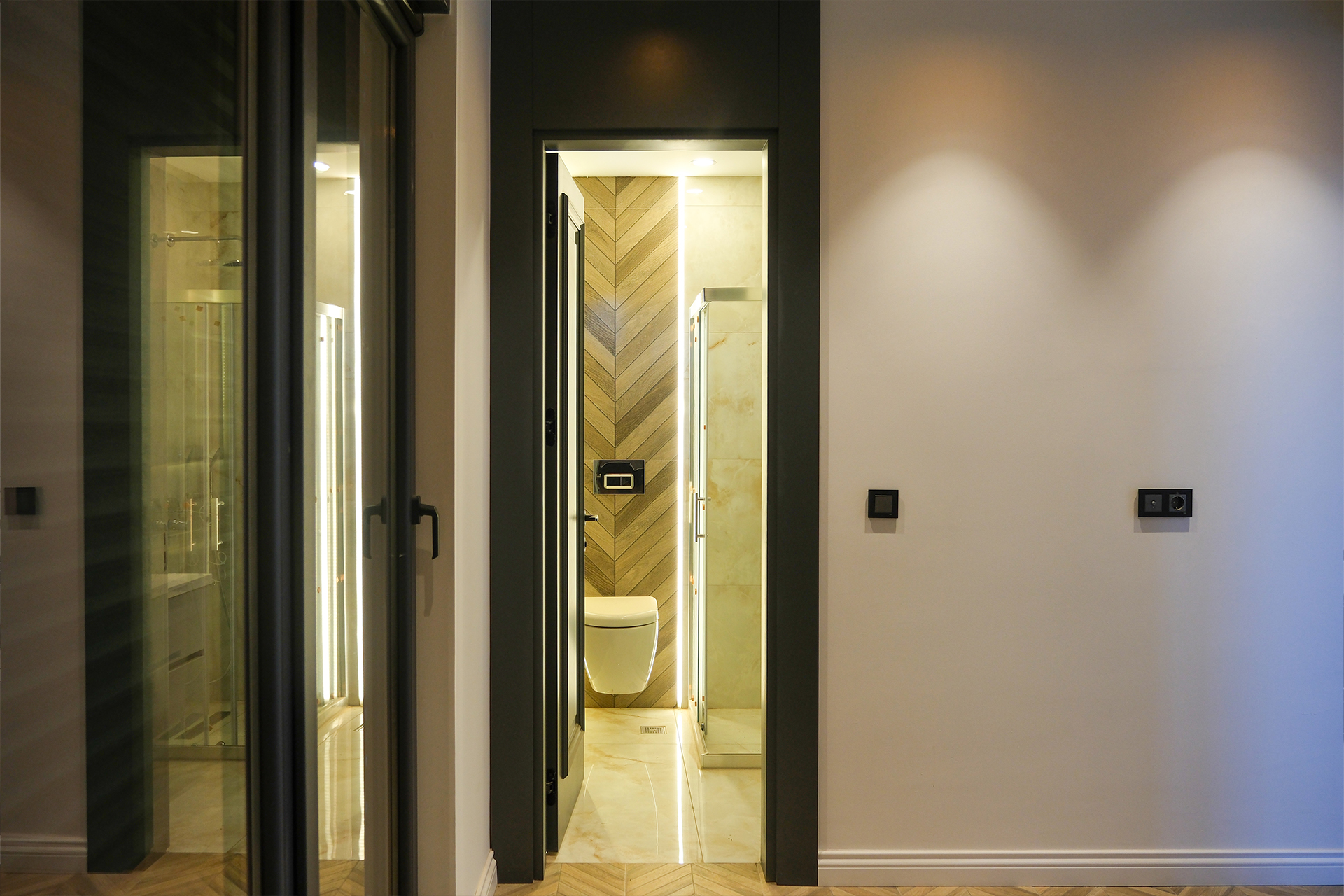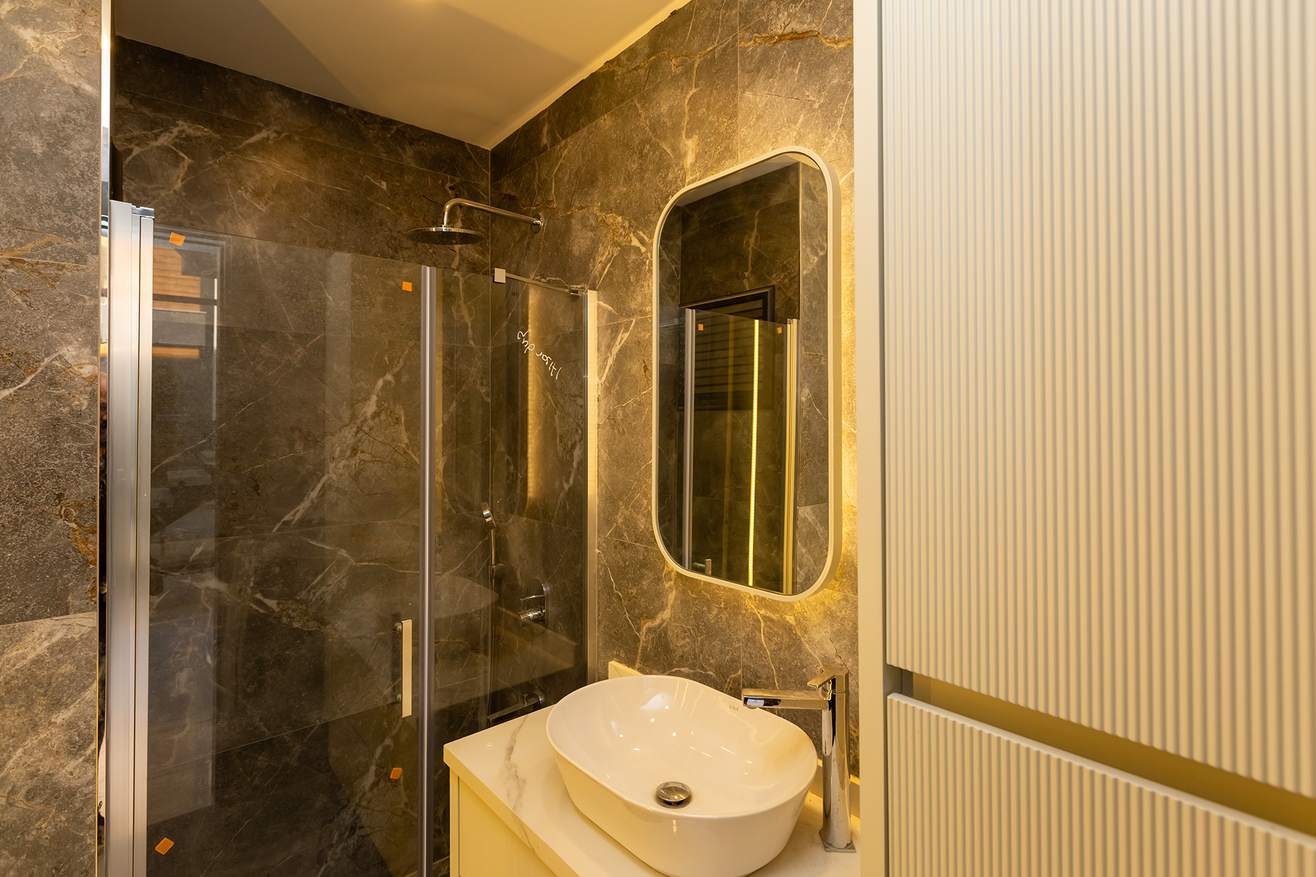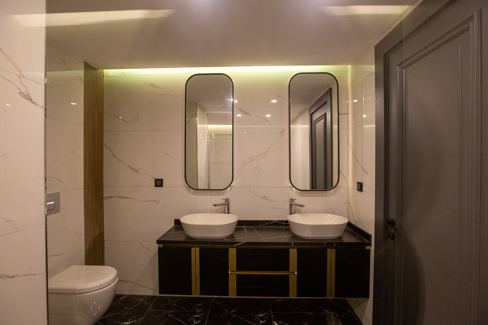 - First class decorative ceramic, glass chrome shower cabin, 1st class sanitary ware and faucet groups, decorative furniture set, aluminum suspended ceiling in bathrooms