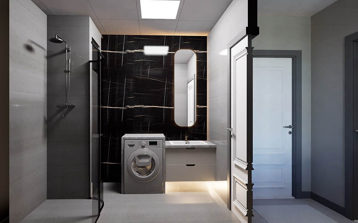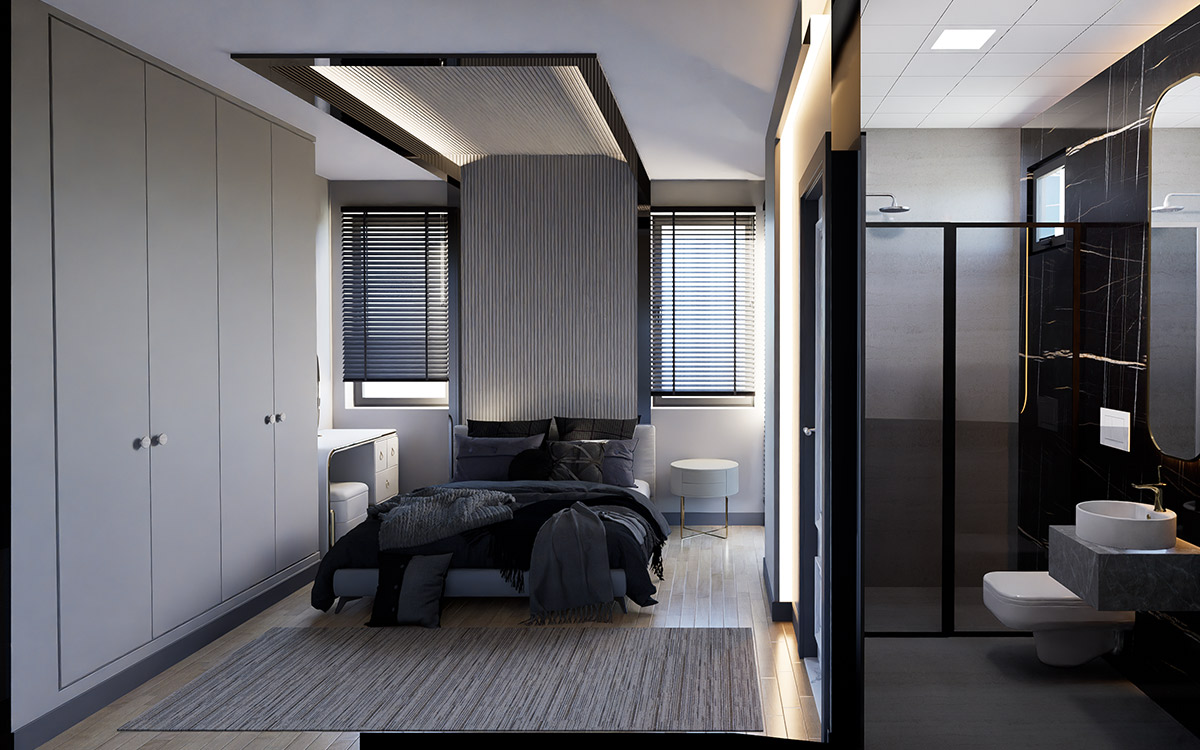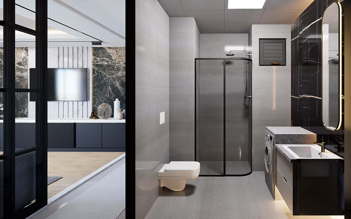 - In the bathrooms; 1st class decorative ceramic, glass chrome shower cabin, 1st class sanitary ware and faucet groups, decorative furniture set, aluminum suspended ceiling