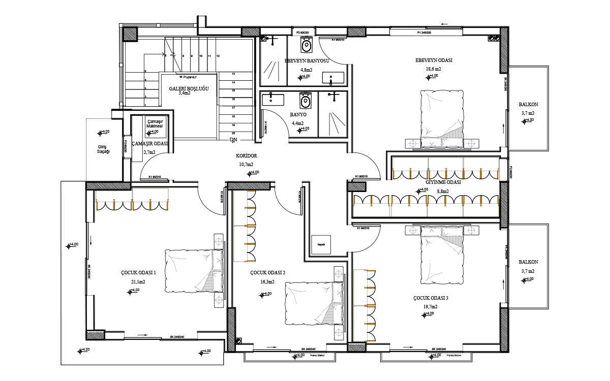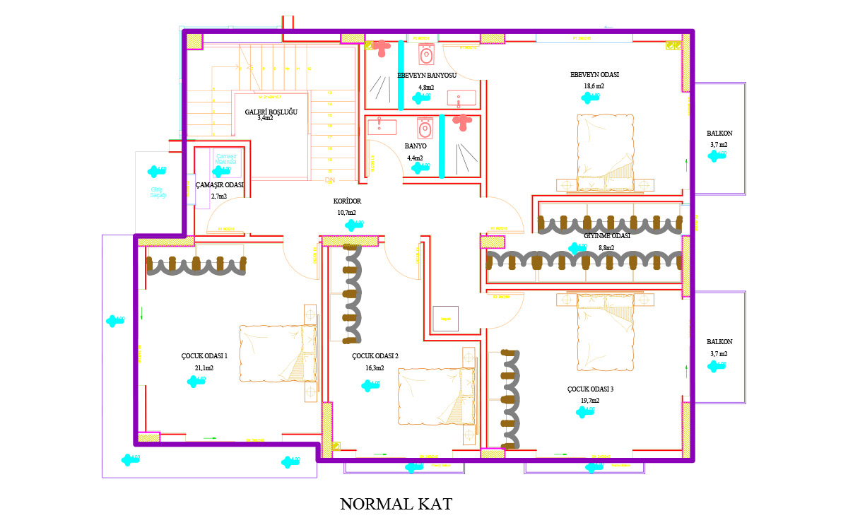 - In the bathrooms; 1st class decorative ceramic, glass chrome shower cabin, 1st class sanitary ware and faucet groups, decorative furniture set, aluminum suspended ceiling